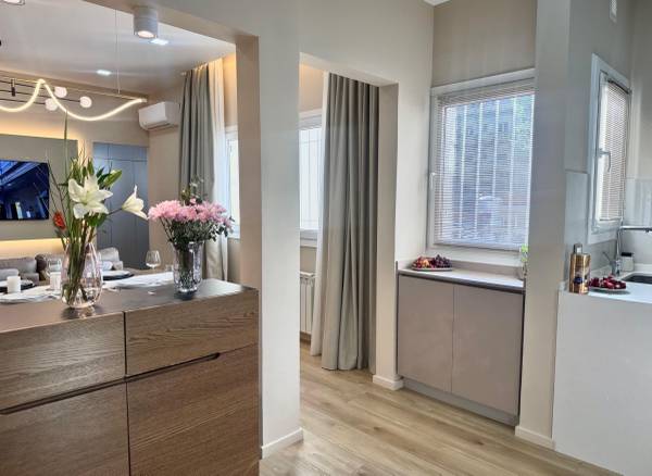 The kitchen is compact but fully functional, with a modern gas stove, built-in oven, microwave, water filter and brand-new refrigerator. Clean lines, neutral tones and natural light give it a sophisticated yet homey feel — ideal for morning coffee or quiet cooking sessions. Plenty of storage space and a sleek layout make it both beautiful and practical.